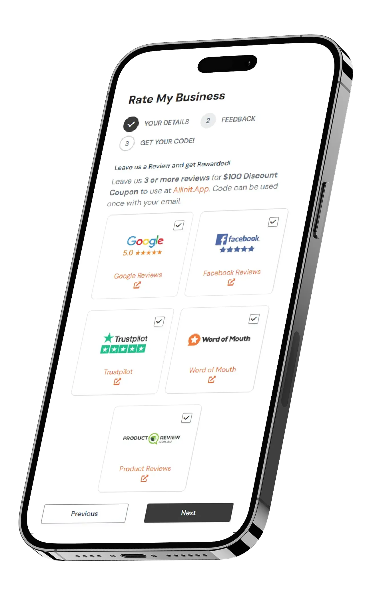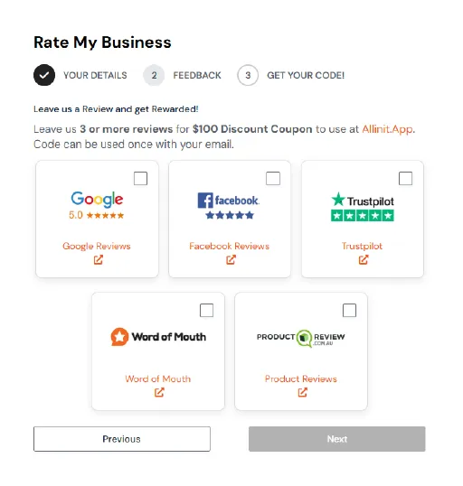 Leave us 3 or more reviews for $100 Discount Coupon to use at Allinit.App. Code can be used once with your email.